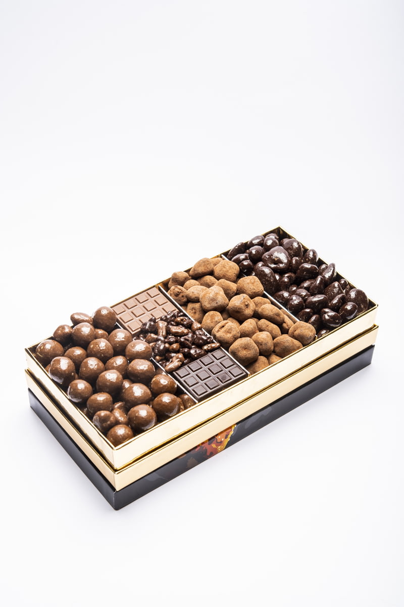 Assortiment de confiseries maison au gré des saisons : Amandes Valencia, Noisettes du Piémont, figues, cranberries, pépite lait, pépite noir, mini tablette chocolat lait, mini tablette chocolat noir...