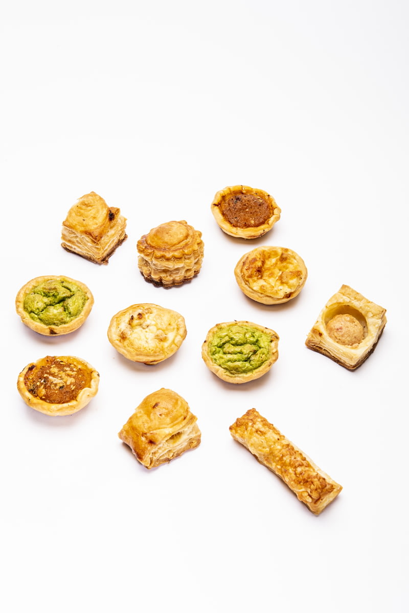 Petits fours salés apéritif au gré des saisons : quiche au jambon - tarte au comté - tarte au poireaux - pizza - alumette - feuilleté olive - feuilleté saucisse - feuilleté jambon moutarde…